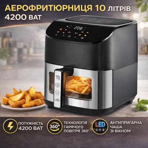 Аэрофритюрница Air Fryer 4200Вт 10л BITEK BT-9501 — это современный кухонный прибор, который позволяет готовить вкусные блюда с минимальным количеством масла или вовсе без него. Благодаря циркуляции горячего воздуха под углом 360° продукты равномерно прожариваются, остаются сочными внутри и приобретают золотистую хрустящую корочку снаружи. С помощью аэрофритюрницы можно жарить, запекать, разогревать и размораживать мясо, рыбу, овощи и картофель, сохраняя их питательные свойства и вкус.