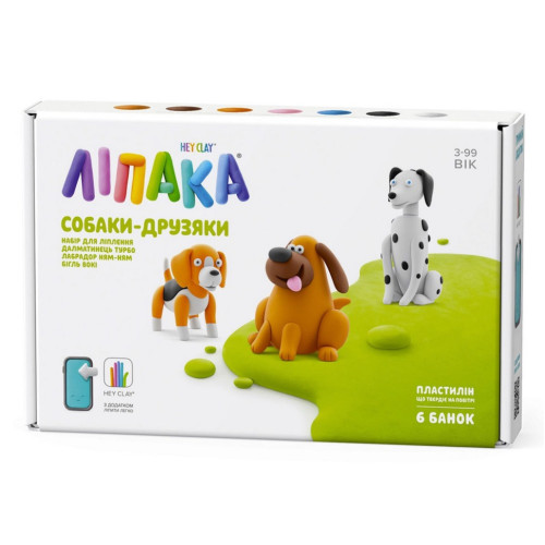 Набор пластилина, который самостоятельно затвердевает, ЛИПАКА – СОБАКИ-ДРУЗЬЯ: КОМОНДОР МУДИ, БУЛЬДОГ ГИПНО, ПУДЕЛЬ ПОППИ – развлечет и малышей, и взрослых. С помощью анимационных инструкций в приложении HEY CLAY, Вы сможете слепить трех забавных героев. Пластилин затвердевает на воздухе в течение 24 часов, после чего можно играть созданными фигурками.