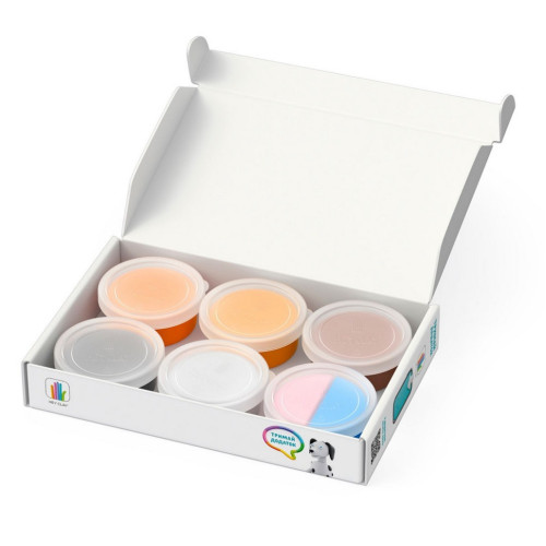 В набор может входить до 7 разных цветов (баночка может содержать пластилин двух разных цветов).