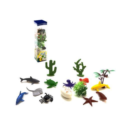 Набор состоит из 12 пластиковых фигурок в колбе с крышечкой в виде животного. В колбе по 10 животных, 4 дерева и яйцо динозавра. Примерный размер фигурки - 3-6 см.