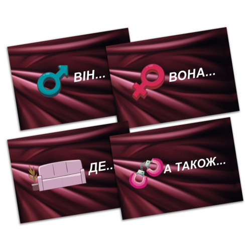 В игре четыре категории карточек: ОН, ОНА, ГДЕ, А ТАКЖЕ. В каждой категории от 13 до 17 вариантов, для объединения в общую картину.