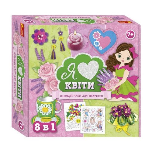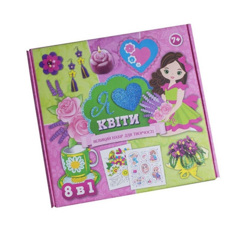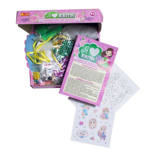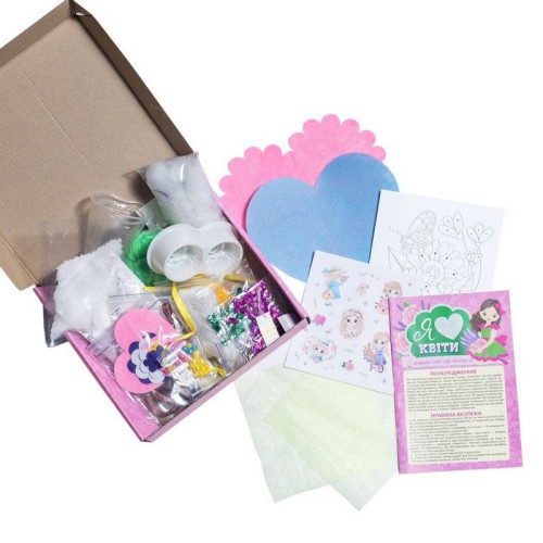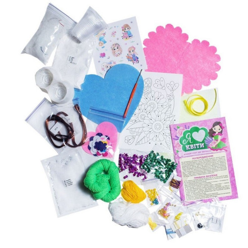 В наборе: паетки, бисер, проволока, пластиковый стаканчик, органза, ленты, гипс, синтепон, бусины, нити, крючок для вязания, игла, швензы, кольца, детали из фетра, шпилька для броши, леска, парафин, краситель для парафина, блистерная форма, релакс-раскраска, инструкция.