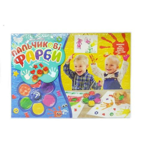 Пальчиковые краски "Мое первое творчество" (укр). Краски для рисования пальцами. В наборе: краски 7 цветов - синий, зеленый, желтый, красный, оранжевый, розовый, фиолетовый, палитра, 3 штампа, глазки, инструкция. Нетоксичны._