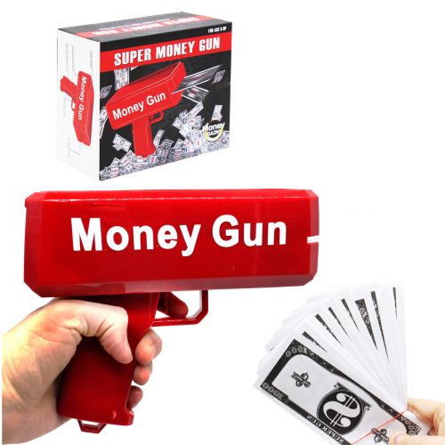Пистолет "Super Money Gun". Необычный, забавный пистолет, который стреляет не пульками или присосками, а настоящими деньгами. С ним можно устроить эффектный фейерверк из бумажных купюр. Купюры необязательно должны быть настоящими  - подойдет и "валюта" из так называемого Банка приколов (есть в комплекте).