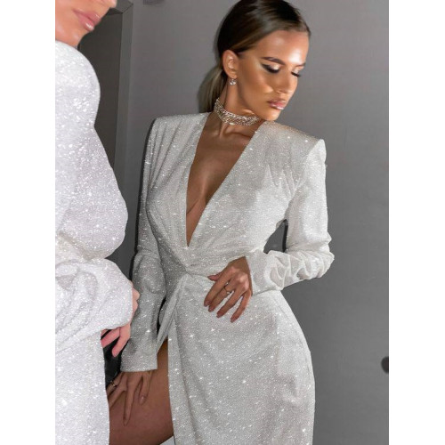 Платье высокий разрез по ноге драппировка в области талии и глубокий вырез горловины серебро