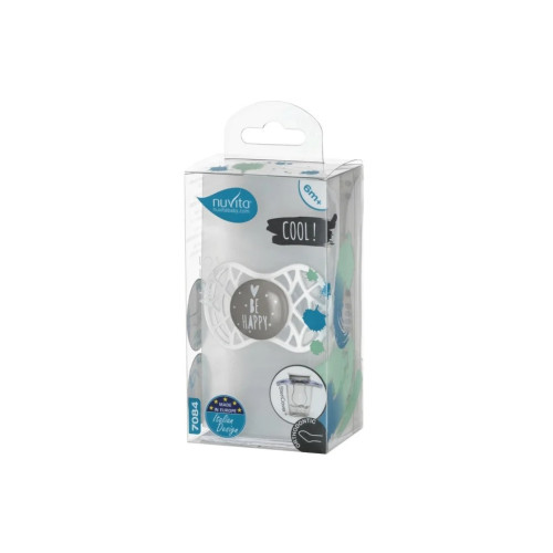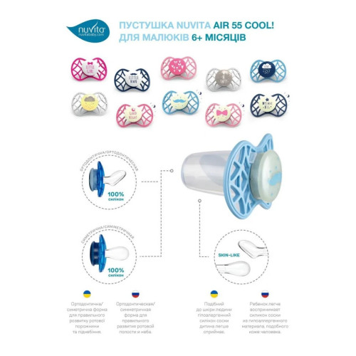 Пустышка ортодонтическая Nuvita Air55 Cool 6m+. Пластинка соски на 55% состоит из воздуха обеспечивая почти полную аэрацию области вокруг рта, избегая скопления слюны, которая может раздражать кожу. Защитный колпачок для соски для поддержания чистоты соски и стерилизации в микроволновой печи простым добавлением воды.