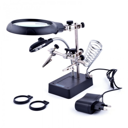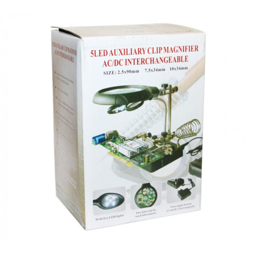 Лупа третья рука с держателем для паяльника будет интересна прежде всего радиолюбителям и всем, кому приходится сталкиваться с пайкой плат и различных мелких предметов. Лупа также может быть полезна и для других точных работ и в рукоделии. Все элементы прибора регулируются, зафиксировать положение не составит труда с помощью винтов. Для дополнительного удобства и для работы в условиях плохого освещения прибор снабжён светодиодным светильником на гибком держателе. Светильник работает от сети 220В, либо от батареек (аккумуляторов) размера AA. Сетевой блок питания входит в комплект поставки. Также в комплект входят дополнительные линзы 7,5x34 и 10x34.