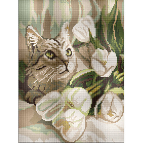 Алмазная мозаика "Зеленоглазый кот с тюльпанами" AMO20099, 30х40 см