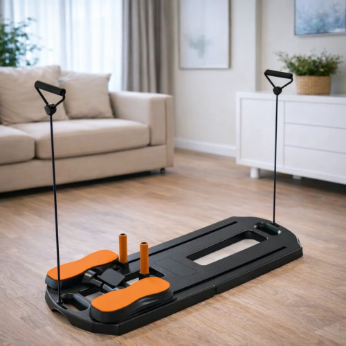 Напольный тренажер MM3000 — это сложная платформа для занятий пилатесом и функциональными упражнениями в домашних условиях. Конструкция сочетает упражнения на полу и тренировки с эластичными резинками в положении стоя.