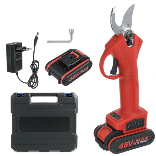 Аккумуляторный секатор 48V — это профессиональный инструмент для быстрой, точной и облегчённой обрезки веток в саду, на огороде, в виноградниках и декоративных насаждениях. Благодаря мощному бесщёточному мотору и двум литий-ионным аккумуляторам, секатор обеспечивает длительную автономную работу и высокую силу реза без нагрузки на руку.