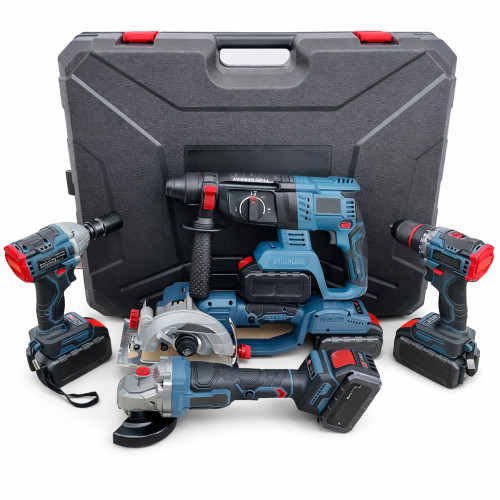 Набор электроинструментов 5-в-1 36V: шуруповёрт, болгарка УШМ, гайковёрт, перфоратор и циркулярная пила + кейс + 4 аккумулятора 5A