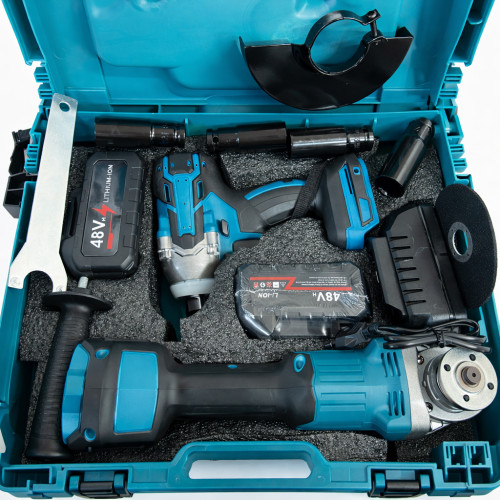 Инструменты работают от съёмных литий-ионных аккумуляторов 48V, поэтому вы не привязаны к розетке и можете комфортно работать во дворе, на парковке или на выезде. Эргономичный сине-чёрный корпус с прорезиненной рукояткой обеспечивает надёжный хват, а все элементы аккуратно уложены в жёсткий кейс с формованными ячейками — удобно переносить и хранить.