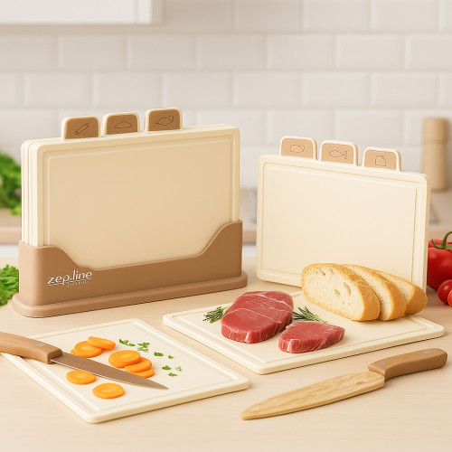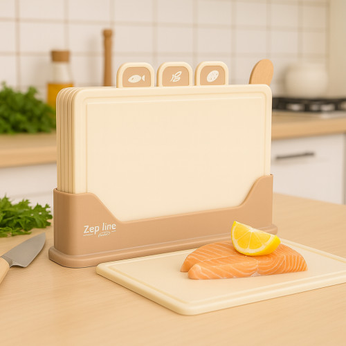 Набор разделочных досок Zepline ZP-00220 Brown Style — это сочетание практичности, уюта и современного дизайна. В комплект входит 5 предметов: четыре доски для разных типов продуктов (мясо, рыба, овощи, хлеб) и эргономичная подставка для аккуратного хранения.
