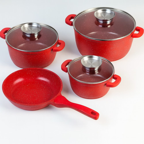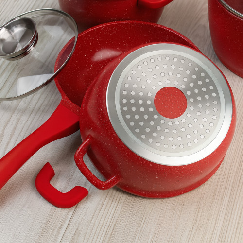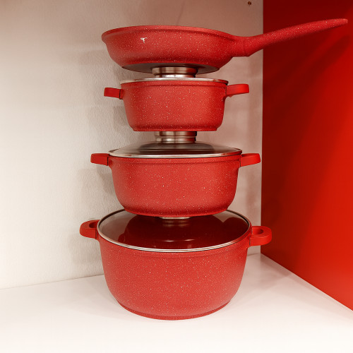 Посуда выполнена из литого алюминия с прочным гранитным антипригарным покрытием, что гарантирует равномерный нагрев, лёгкость в уходе и долговечность. Современный дизайн, сочетание чёрного или красного цвета и элегантных линий придают набору премиальный вид.