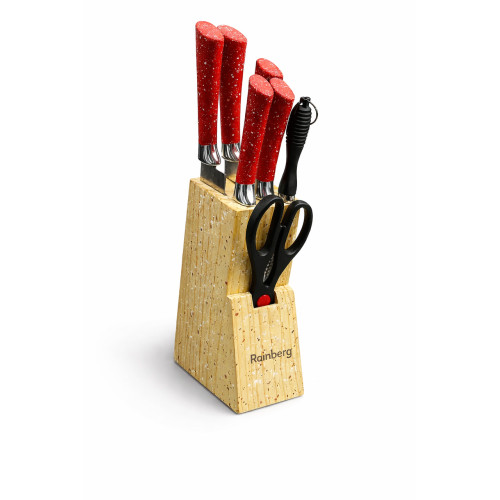 Набор кухонных ножей Rainberg RB-2328 Красный с деревянной подставкой, мусатом и ножницами, 5 ножей, нержавеющая сталь
