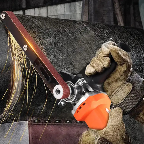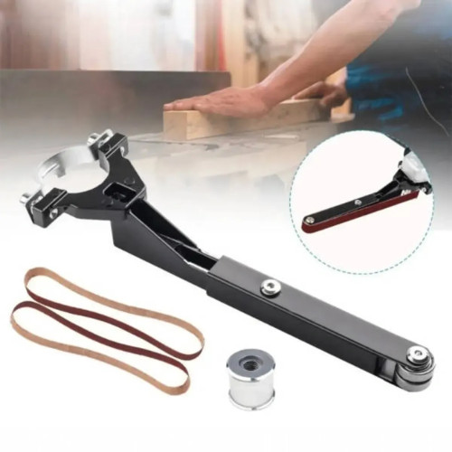 Ленточная шлифовальная насадка-адаптер для угловой шлифовальной машины предназначена для превращения стандартной УШМ (болгарки) в мини-ленточный гриндер. Насадка совместима с моделями УШМ, имеющими резьбу шпинделя M10 или M14, и подходит для дисков диаметром 100–125 мм.