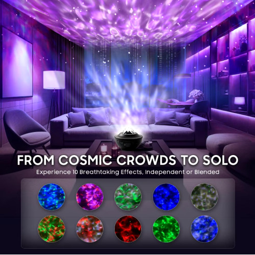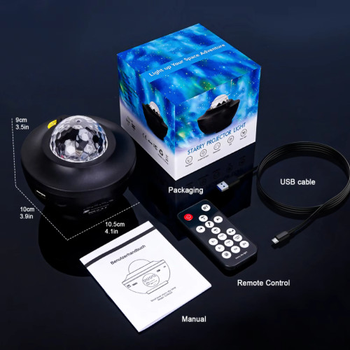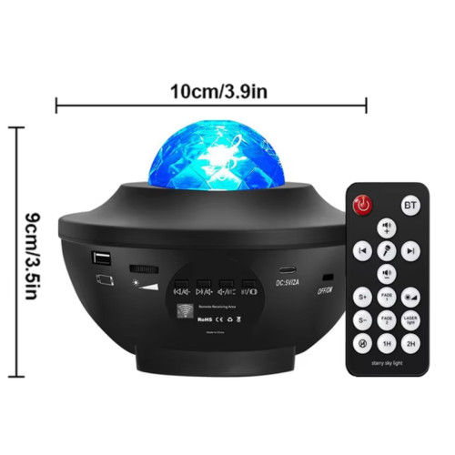 Проектор идет в комплекте с пультом дистанционного управления (работает от 2 батареек AAA, не входят в комплект). Не нужно вставать с кровати или дивана, чтобы включить или выключить галактический проектор. С помощью пульта дистанционного управления можно регулировать яркость, включать/выключать лампу, изменять режимы, музыку, устанавливать таймер. Последний режим мерцания с активированным звуком позволяет проекции менять цвета в соответствии с музыкальным ритмом.