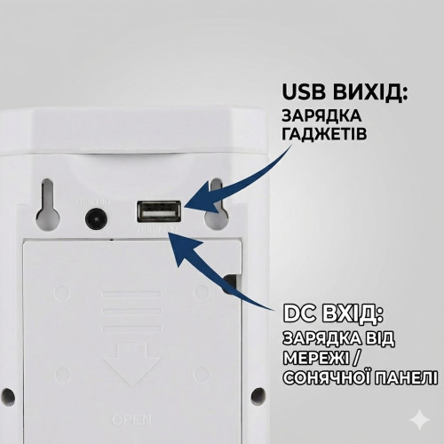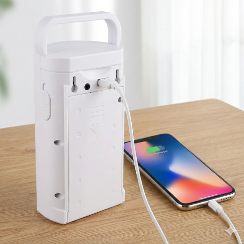 Фонарь можно использовать как настольный светильник или переносной свет. Он выручит при отключении электроэнергии, на лестничной клетке, в частном доме, мастерской или на выезде. Наличие USB-выхода позволяет при необходимости подзарядить мобильный телефон или небольшой гаджет. Через разъём DC возможно подключение солнечной панели (если она есть), что удобно для автономного использования.