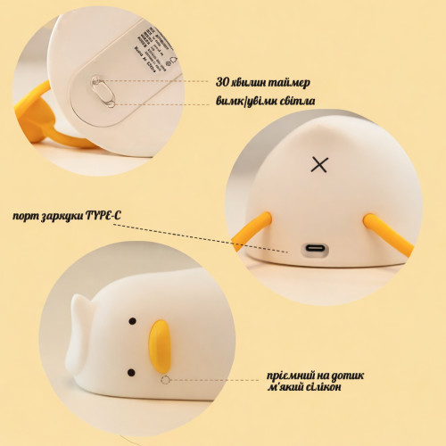 Милый ночник в виде уставшей утки создаст атмосферу спокойствия и безопасности в детской комнате. Мягкий теплый свет помогает ребенку расслабиться и поскорее уснуть, а приятный на ощупь пищевой силикон делает эту лампу абсолютно безопасной даже для самых маленьких пользователей.