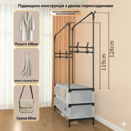 Штанга для вешалок: Прочная верхняя перекладина позволяет развесить повседневную одежду (рубашки, платья, ветровки) на плечиках, предотвращая их сминание.