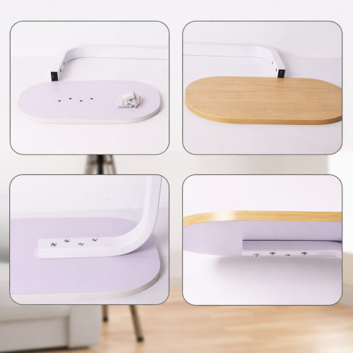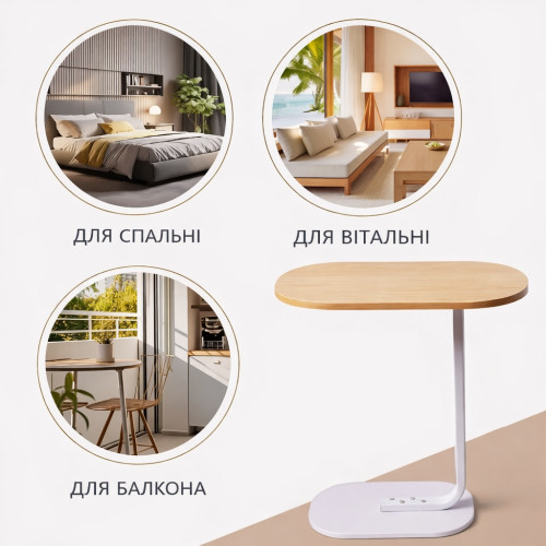 Столик оснащён прочным металлическим каркасом белого цвета, который обеспечивает устойчивость и долговечность конструкции. Столешница выполнена из качественного ДСП в цвете светлого дерева, устойчива к повседневным нагрузкам и проста в уходе.