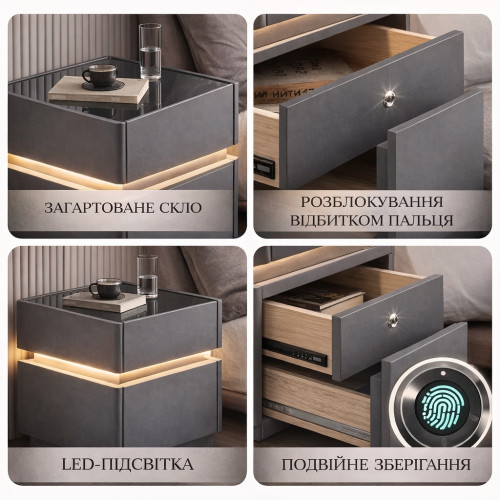 Современная многофункциональная прикроватная тумба — это не просто мебель, а полноценный технологичный центр комфорта в вашей спальне.Элегантная отделка из экокожи придаёт интерьеру премиальный вид, а встроенная LED-подсветка создаёт мягкую атмосферу уюта в вечернее время.