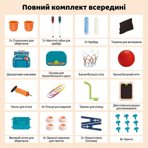 Набор аксессуаров в комплекте – маркеры, мелки, губка/стиратель, магнитные элементы и другие полезные аксессуары для старта.