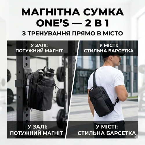Описание Магнитный подсумок One's — это инновационный аксессуар, разработанный специально для активных людей и любителей фитнеса. Главная особенность сумки — мощный встроенный магнит, который позволяет мгновенно закрепить её на любой металлической поверхности: тренажерах, рамах, шкафчиках или даже на кузове автомобиля. Вам больше не нужно ставить бутылку с водой или телефон на грязный пол в спортзале — теперь ваши вещи всегда на уровне глаз и под рукой. Несмотря на компактные размеры, подсумок очень вместителен и легко заменяет повседневную барсетку, позволяя носить её через плечо благодаря регулируемому ремню.