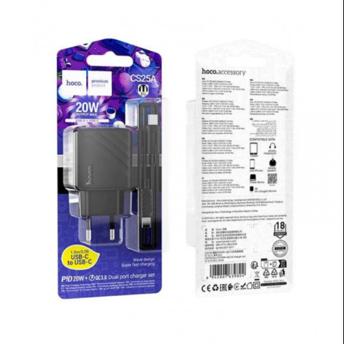 Сетевое зарядное устройство адаптер HOCO CS25A с кабелем Type C/Type C Rico 1USB/1Type-C, 20W/3A, поддержка быстрой зарядки