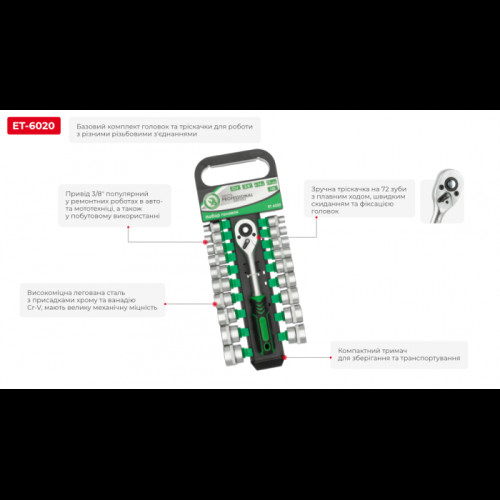 Набор торцевых головок с трещоткой 3/8" 20 ед., 72 зуба, Cr-V INTERTOOL ET-6020