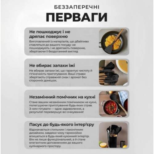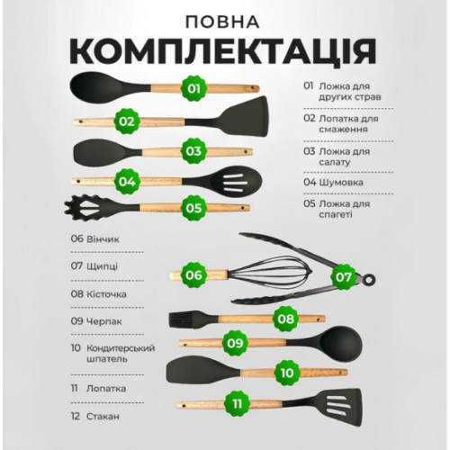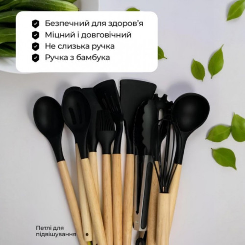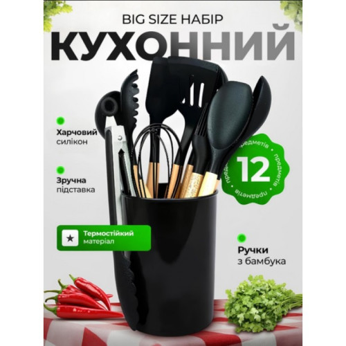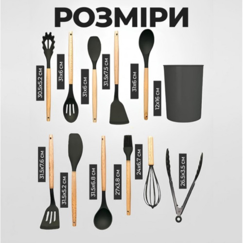 Кухонный набор принадлежностей из силикона - незаменимый надежный помощник на Вашей кухне, представляет собой 11 необходимых предметов для каждой хозяйки + ведерко для хранения и подставку для уже используваной кухонной утвари, что бы не испачкать кухонный стол.