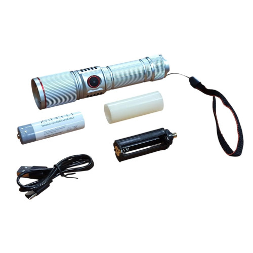 аккумуляторный фонарь• Цвет: серый• Тип питания: аккумулятор 18650 (съёмный)• Тип лампы: светодиодная• Материал корпуса: алюминиевый сплав• Тип зарядки: от USB• Функции: ZOOM• Тип фонаря: ручной• Защита: противоударныйКомплектация:• Фонарь на аккумуляторе CB-S009-4• Кабель для зарядки USB - Type C• Аккумулятор 18650• Гильза под батарейки формата ААА• Упаковка