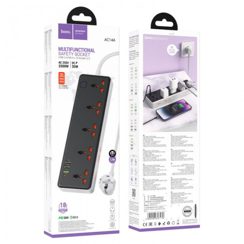 Сетевое зарядное устройство удлинитель HOCO AC14A Rico 3 USB/ Type-C 5 розеток 1,5m PD/QC, 3A/30W