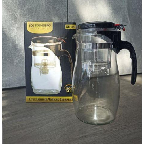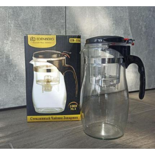 Нержавеющий фильтр чайника имеет 80 отверстий. Даже из чайного порошка можно сделать мягкий и чистый чай без осадков. Чайнки Edenberg подходит для заварного черного чая, чай пуэра, зеленого чай, травяных чай, фруктового и цветочного чая, кофе.Внутренний фильтр и другие пластиковые детали используют пищевой материал, который не вредит здоровью.Характеристика заварочного чайника Edenberg Материал колбы: термостойкое стекло Внутренний фильтр, верхняя крышка, кнопка воды и ручка: пищевой пластик Объем: 1000мл Можно мыть в посудомоечной машине: Да