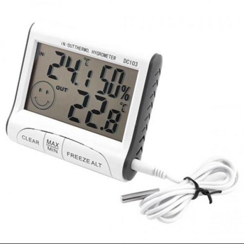 Кроме температуры и влажности в помещении, прибором можно измерять температуру воздуха на улице с помощью идущего в комплекте выносного датчика температуры длинной 1 метр. Работает DC-103 от одной Батарейка AG13. Поставляется в блистерной упаковке.