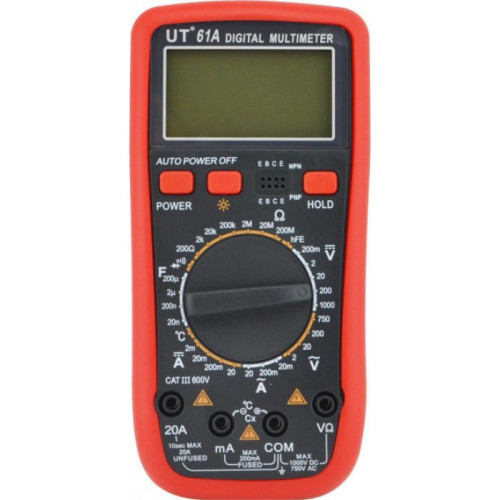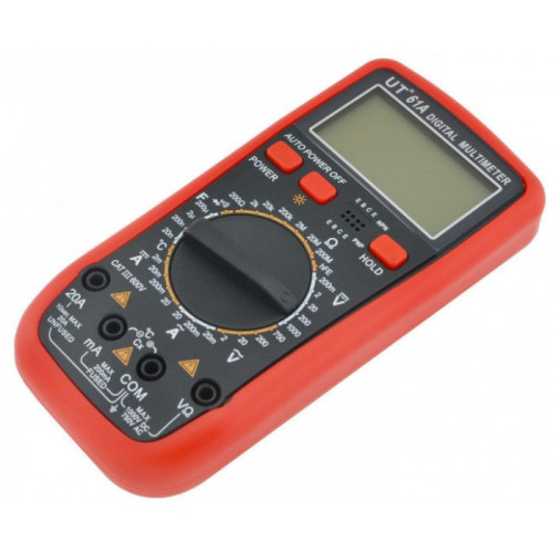 Цифровой мультиметр UT61A предназначен для измерения сопротивления, постоянного и переменного токов, прозвонки, измерения емкостей, температуры. Главные отличия от более дешевых аналогов: прорезиненный корпус, белая подсветка, большой экран, качество щупов и проводов заметно улучшено.