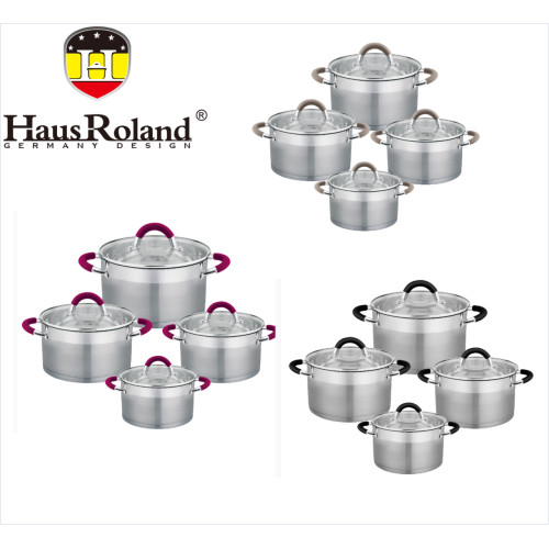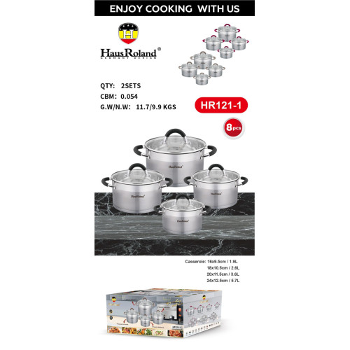 Набор кастрюль Haus Roland HR121-1 — это выбор тех, кто не ищет компромиссов между эстетикой и практичностью. Изготовленный из высококачественной нержавеющей стали 201, он гарантирует долговечность, гигиеничность и устойчивость к коррозии. Эффектное сочетание матовой (сатиновой) полировки корпуса с широкой зеркальной полосой придает посуде современный и дорогой вид. Особое внимание уделено комфорту: полые ручки из нержавеющей стали оснащены термостойкими силиконовыми накладками. Они не нагреваются во время готовки, обеспечивают надежный, нескользящий хват и делают использование посуды максимально безопасным. Внутренняя сатиновая полировка устойчива к царапинам, а мерная шкала позволяет точно дозировать ингредиенты. Многослойное капсульное дно обеспечивает быстрый и равномерный нагрев на всех типах плит, включая индукционные. Завершают образ стильные плоские крышки из закаленного стекла для полного контроля над процессом приготовления. Преимущества Эргономичные ручки: Ненагревающиеся ручки с силиконовыми вставками для безопасного и удобного хвата. Эффектный дизайн: Комбинация сатиновой и зеркальной полировки для стильного внешнего вида. Внутренняя мерная шкала: Позволяет точно отмерять жидкости без мерного стакана. Универсальное дно: Подходит для всех типов плит, включая индукционные. Визуальный контроль: Современные плоские крышки из закаленного стекла для наблюдения за готовкой. Технические характеристики Артикул: HR121-1 Бренд: Haus Roland Материал корпуса: Нержавеющая сталь 201 (толщина 0.5 мм) Покрытие: Снаружи – сатиновая полировка с зеркальной полосой, внутри – сатиновая полировка Дно: Многослойное капсульное, основание из стали 430 Ручки: Полые из нержавеющей стали с силиконовыми накладками Крышки: Плоское закаленное стекло Особенности: Внутренняя мерная шкала Совместимость с плитами: Все типы, включая индукционные Вес: 4,95 кг Комплектация набора (8 предметов) Кастрюля с крышкой: диаметр 16 см, высота 9.5 см, объем 1,9 литра Кастрюля с крышкой: диаметр 18 см, высота 10.5 см, объем 2,6 литра Кастрюля с крышкой: диаметр 20 см, высота 11.5 см, объем 3,6 литра Кастрюля с крышкой: диаметр 24 см, высота 12.5 см, объем 5,7 литра