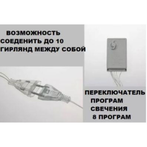 Всего гирлянда насчитывает 138 LED лампочек голубого холодного цвета и 8 режимов их свечения с очень удобным переключателем (в том числе и статический режим - горение без мигания).