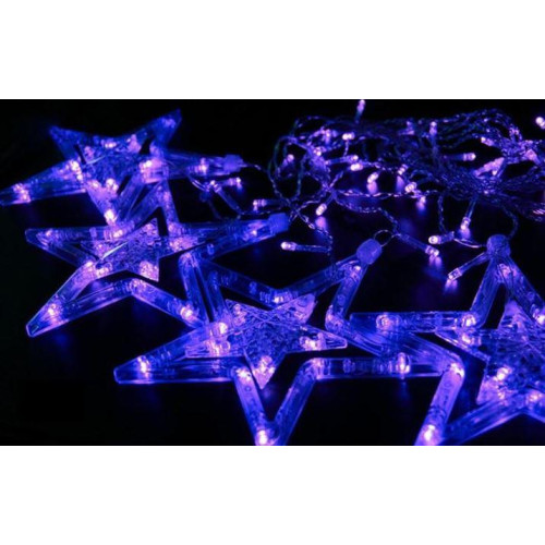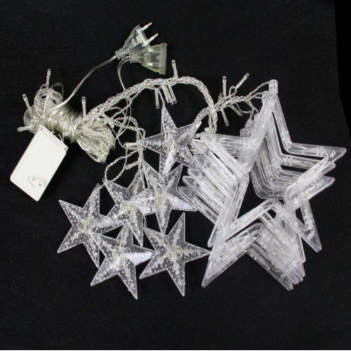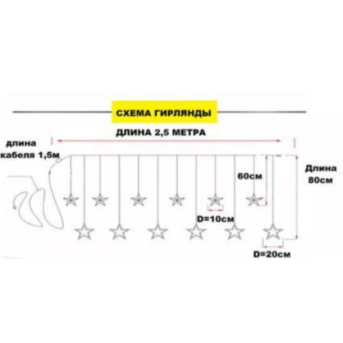 Светодиодная гирлянда-штора состоит из 2.5-метрового шлейфа-основания с вертикально свисающими 12 нитями разной длины: 6 больших звезд и 6 звезд поменьше.