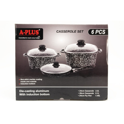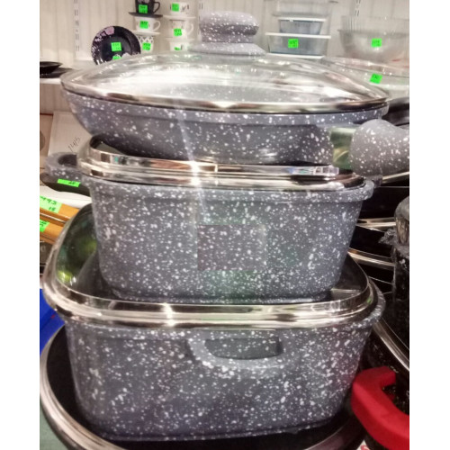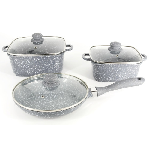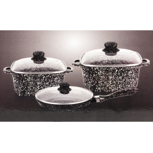 ННабор изготовлен из кованого алюминия, имеет толстые стенки и дно, что обеспечивает равномерное распределение и сохранение тепла. Благодаря покрытию, посуда имеет высокую прочность и износостойкость. Главная особенность такой посуды - возможность приготовления вкусной и полезной пищи без добавления масла. Мраморное покрытие безопасно для здоровья человека и позволит сохранить в продуктах максимум витаминов. К кастрюлям идут крышки из жаропрочного стекла с отверстием для выхода пара. Ручки изготовлены из бакелита. Посуда пригодна для использования на плитах любого типа, в том числе и индукционных.