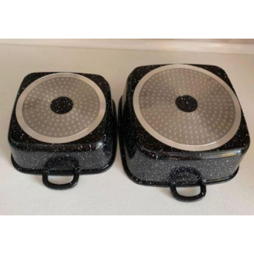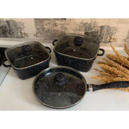 В набор входит 2 кастрюли квадратные с крышками и сковорода: