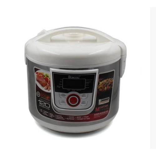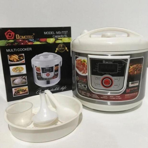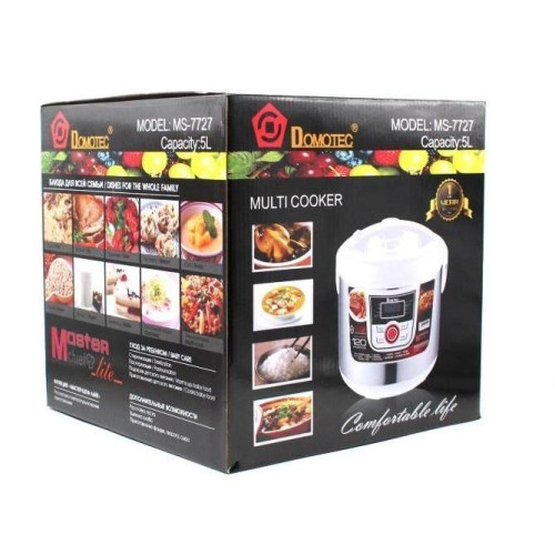 Domotec 7727 - то очень надежная, простая в эксплуатации мультиварка на 5 литров. Ее мощность составляет 900 Вт. Мультиварка имеет 12 различных программ для приготовления на пару, жарку, тушение, выпечку и приготовление йогуртов и др.. Дисплей дает возможность контролировать процесс приготовления пищи. Кроме того мультиварка имеет функцию стерилизации и выпечки хлеба.Для повышения удобства предусмотрена функция отложенного старта до 24 часов. Благодаря этому вы можете поместить ингредиенты в чашу, установить нужный режим и выставить время, через которое мультиварка включится и начнет приготовление блюда. Таким образом, к примеру, по приходу с работы, вас будет ждать уже приготовленное, свежее и теплое блюдо. Также мультиварка имеет функцию поддержания температуры, благодаря которой Ваша еда будет сохраняться в мультиварке горячей долгое время.Характеристики:Потребляемая мощность: 900 Вт;Управление: электронное;Материал корпуса: металл;Объем: 5 л;Покрытие чаши: тефлоновое;Поддержание тепла: да;Отложенный старт: да;Максимальное время установки таймера: 24 ч;Автоматические программы: Плов, тушение, жарка, приготовление круп, выпечка, приготовление йогурта, тесто, пастеризация.Комплектация:Мультиварка;Съемная чаша;Мерный стаканчик;Суповая ложка;Лопатка;Съемный контейнер для приготовления пищи на пару;Шнур питания;Инструкция;