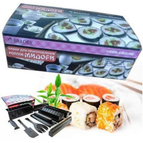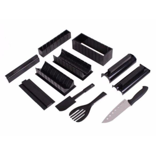 Набор Суши (Мидори) состоит из различных форм, каждая из которых предназначена для изготовления роллов определенной формы. Также в наборе присутствует специальный нож для нарезки роллов и две лопатки для разравнивания и трамбовки риса.