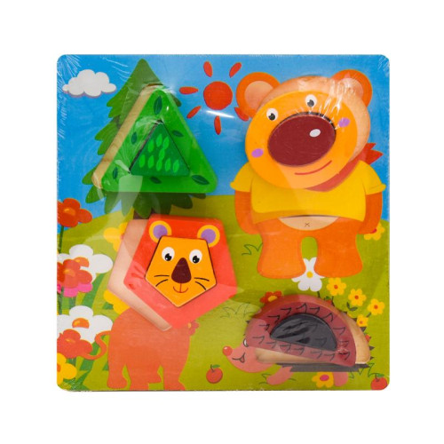 Красочную картинку со зверушками небходимо дополнить геометрическими фигурками-вкладышами. Игрушка развивает логическое и пространственное мышление, помогает запомнить геометрические фигуры.