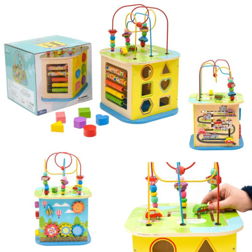 Деревянный развивающий центр с пальчиковым лабиринтом для малышей содержит в себе несколько увлекательных игр, которые направлены на ту или иную область развития ребёнка, а также сверху игровое поле с машинками.