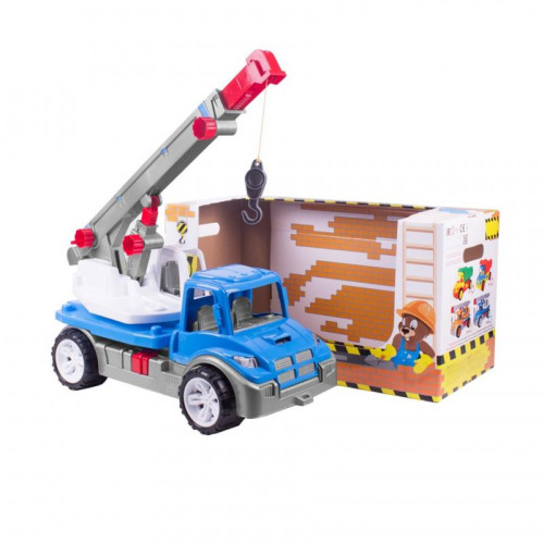 Игрушки из пластмассы имеют много преимуществ: они устойчивы к влажности, температурным перепадам. За такими игрушками проще ухаживать, легко продезинфицировать. Конструкции из пластика обтекаемы, упруги, устойчивы, в них как правило отсутствуют острые углы. Также, пластиковые игрушки выделяют доступная цена и простота сборки. Красивый, многофункциональный автомобиль, имеет поворачивающуюся площадку с выдвижной стрелой, которая может подниматься.