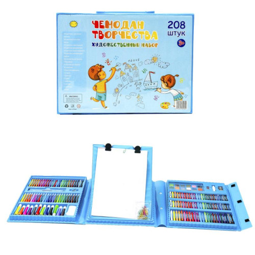 В комплекте: 48 цветных мелков, 24 восковых мелка, 24 цветных карандаша, 24 фломастера, 12 цветных мини маркеров, 18 акварельных красок, 10 листов белой бумаги, 1 мольберт, 4 зажима для бумаги, 35 скрепок, 1 простой карандаш, 1 ластик, 1 точилка, 1 губка, 1 линейка, 1 кисточка, 1 клей. Упаковка легко трансформируется в мольберт, где можно зафиксировать бумагу, и рисовать в удобном для глаз и позвоночника положении. Обилие материалов и яркий цвет станут для ребёнка дополнительной мотивацией к творческим занятиям.