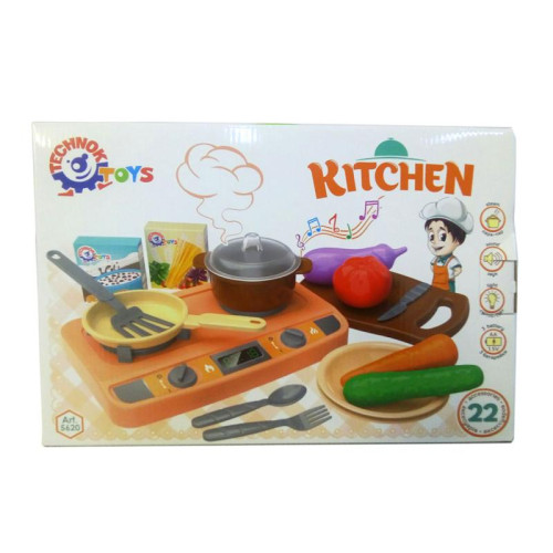 Набор состоит из плиты, кастрюли, сковородки, тарелки, приборов и продуктов. Игрушка со звуковыми эффектами.