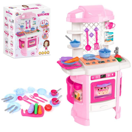 Комплектация: игрушечная кухня, варочная панель с электронным модулем, кран, досточка, кастрюля с крышкой, сковородка, чашка - 2шт., блюдце - 2шт., ложка - 2шт., вилка -2шт., нож - 2шт., тарелка - 2шт. , сахарница с крышкой, вилка большая, шумовка, лопатка, черпак, огурец, морковь, баклажан, помидор, коробочка - 2шт., губка.