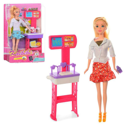 Высота куклы 30 см.В наборе кукла предстается в роли врача. Одета в медицинский белый халат. В комплект с куклой - доктором входит набор медицинского оборудования для врачебного кабинета.